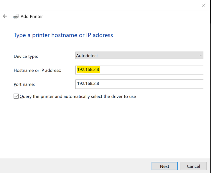 Enter the IP address you noted from the printer and press next (not 192.168.2.8 displayed in the graphic below, unless your printer has that IP address).