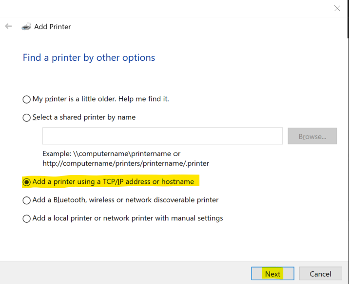 This article explains how to connect to a printer using an IPv4 address on a Windows 10 machine. You might use this method if automatic discovery does not find the printer you are trying to add.