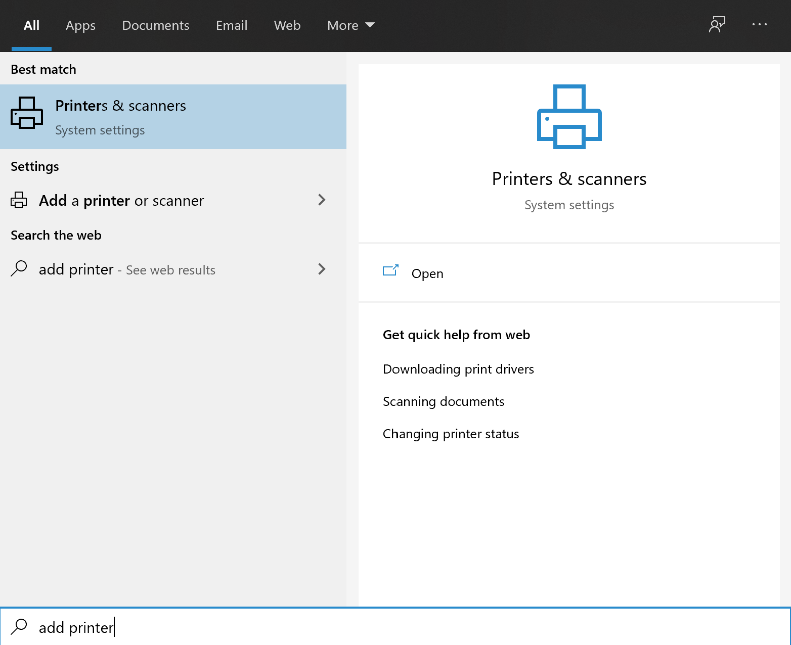 Open the start menu and type in "add printer." Click on "Printers & scanners."