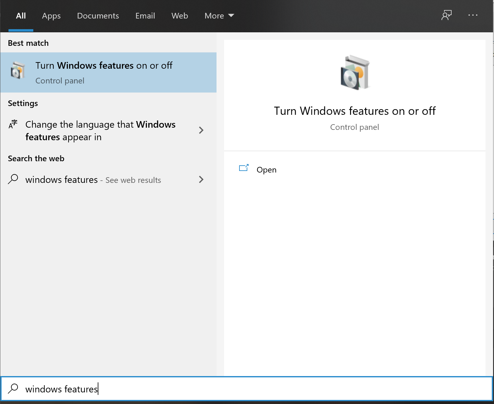 Press the start menu and type in "windows features." Click on "Turn Windows features on or off."